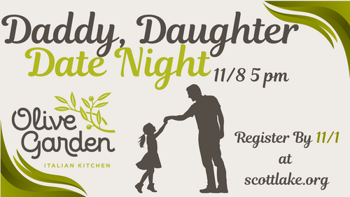 Join us for a Daddy-Daughter Date Night at Olive Garden on November 8 at 5 PM! Dress up, bring your smiles, and make unforgettable memories. We will meet at Olive Graden at Lakeside Village. Our reservation will be at 5 PM. Each family will be paying for their own meal. Grandfathers are welcome to participate as well.